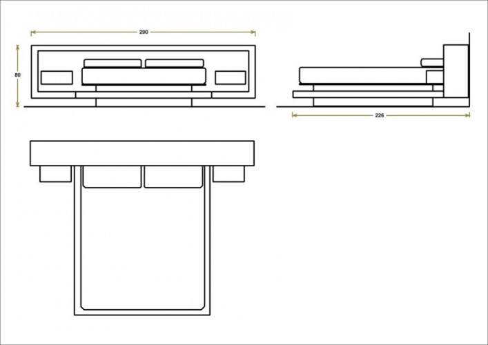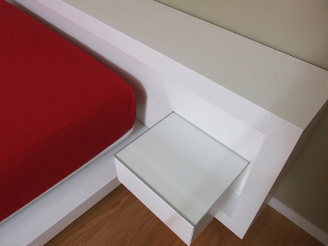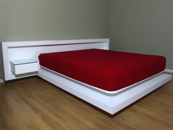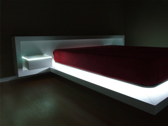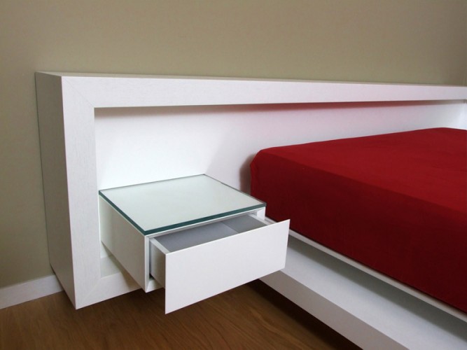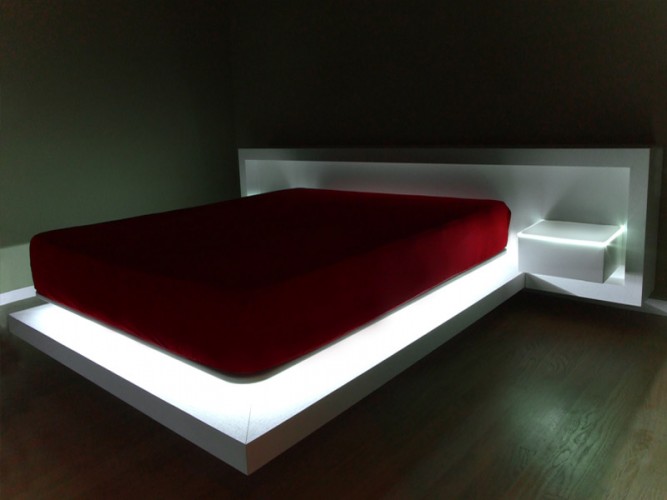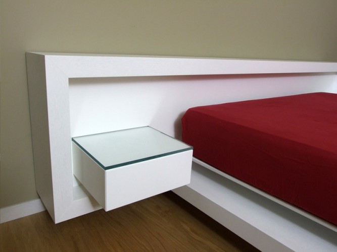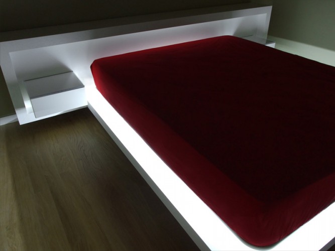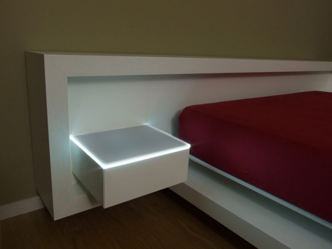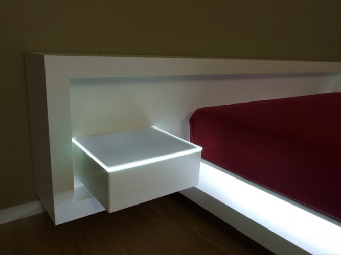 Letto matrimoniale caratterizzato dal suo design apparentemente sospeso, composto da testata letto attrezzata con cassetti sospesi e piani in cristallo retroilluminati a led, completo di illuminazione a led alla base del letto. Disponibile con finitura in legno Rovere naturale o tinto, con zone in laccato opaco.