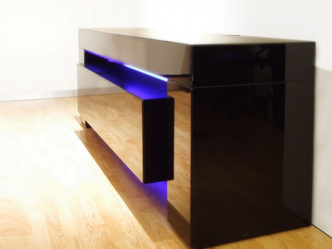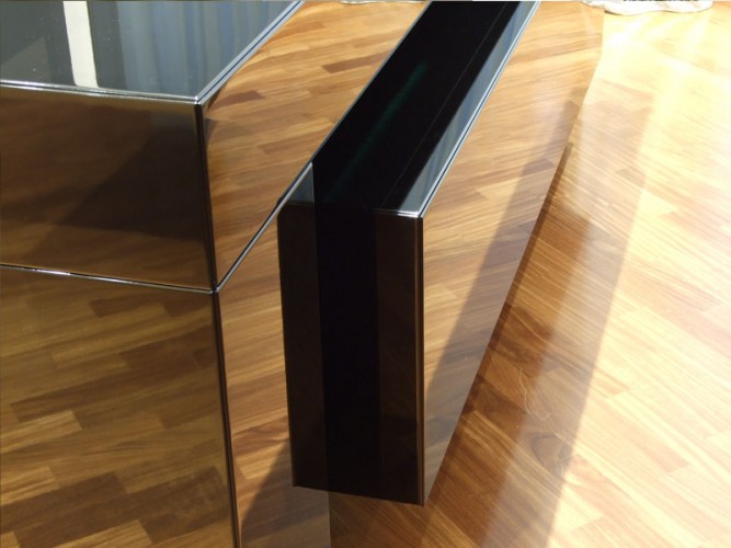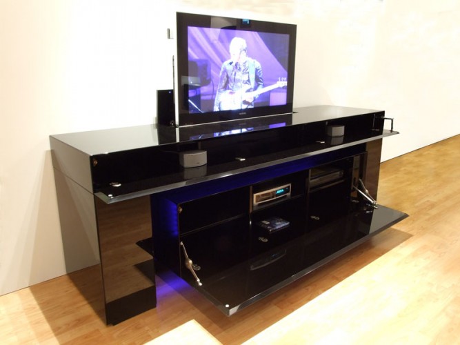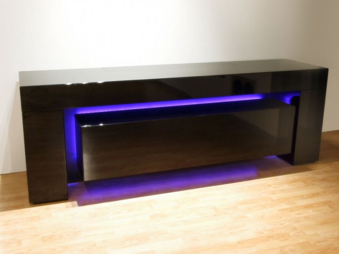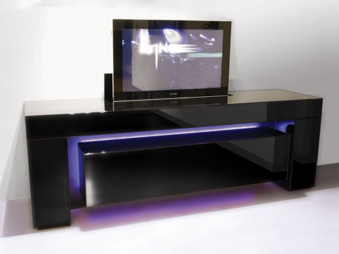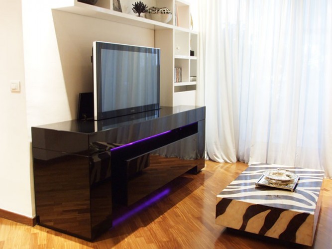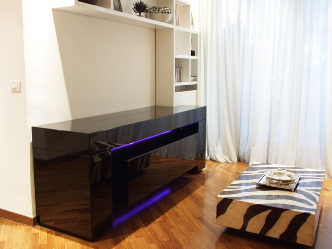 Madia in versione home-cinema o semplice contenitore, caratterizzata dal suo design esclusivo dato dalla struttura a ponte in cui si inserisce l’elemento centrale visivamente sospeso per effetto di un fascio luminoso a led. Tutte le ante e i cassetti sono assemblati agli elementi strutturali con gli spigoli a 45°. La versione home-cinema è equipaggiata con meccanismo di sollevamento TV LCD fino a 50'' oppure con schermo di proiezione motorizzato fino a 90'', con le due ante a ribalta con sistema di apertura e chiusura motorizzata, tutte assistite da un pannello di controllo o da telecomando.Disponibile con finitura in laccatura lucida o opaca nei colori RAL o rifinita in essenza di Wengè, Rovere, Acero, Teak.